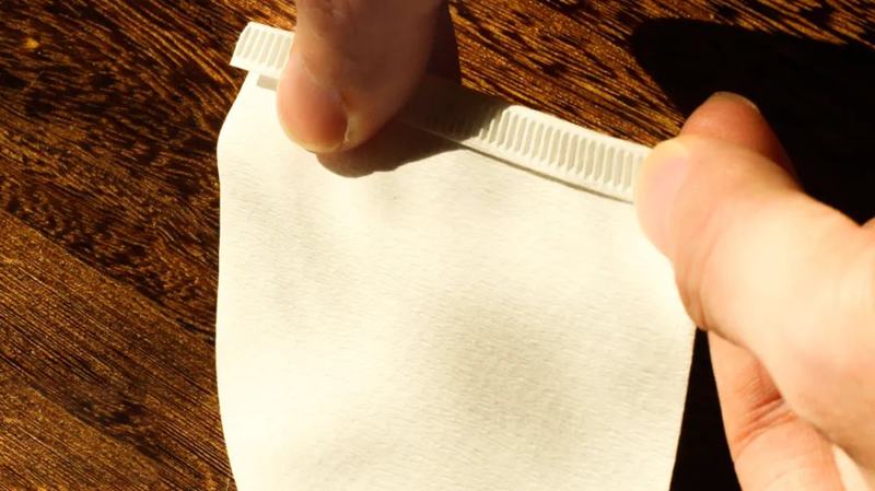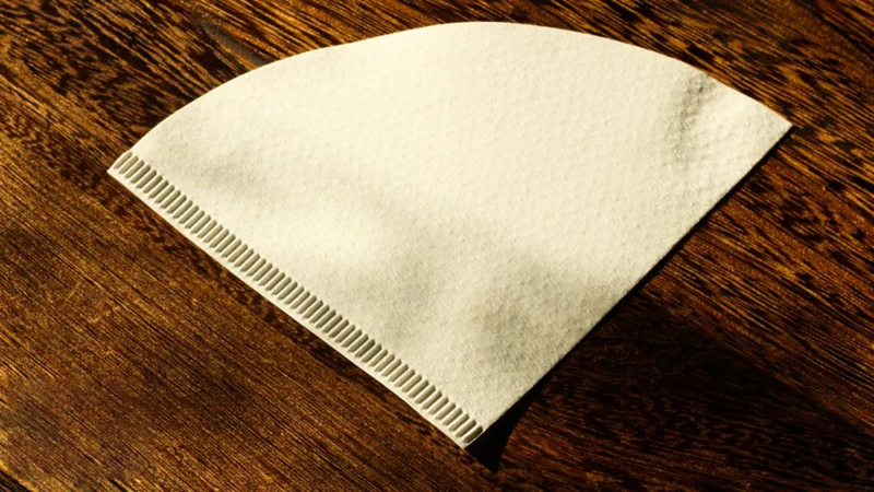 يوجد أدناه ورق ترشيح مخروطي من لب الخشب المبيّض، ويمكن ملاحظة أن هناك خط خياطة على جانب واحد من ورق الترشيح.