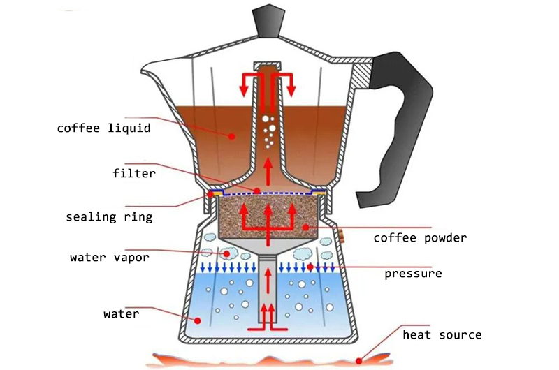 نظرًا لأن وعاء الموكا يمكنه صنع قهوة الإسبريسو اللذيذة، فلنلقي نظرة على هيكل وعاء الموكا. يتكون وعاء الموكا من وعاء علوي، ووعاء مسحوق، ومقعد سفلي. الوعاء السفلي عبارة عن خزان مياه لحفظ الماء، وخزان المسحوق يستخدم لحفظ مسحوق القهوة، والوعاء العلوي يستخدم لحفظ سائل القهوة المستخرج. مبدأ استخلاص القهوة من وعاء الموكا بسيط للغاية، وهو استخدام ضغط البخار المتولد في الوعاء السفلي. عندما يصل ضغط البخار إلى مستوى معين، فإنه سيدفع الماء الساخن إلى الوعاء العلوي ويصنع قهوة قوية وعطرة. من خلال الصور التالية، يمكن رؤيتها بنظرة واحدة، حيث تعرض هيكلها الداخلي ومبدأ استخلاص القهوة بشكل واضح للغاية.